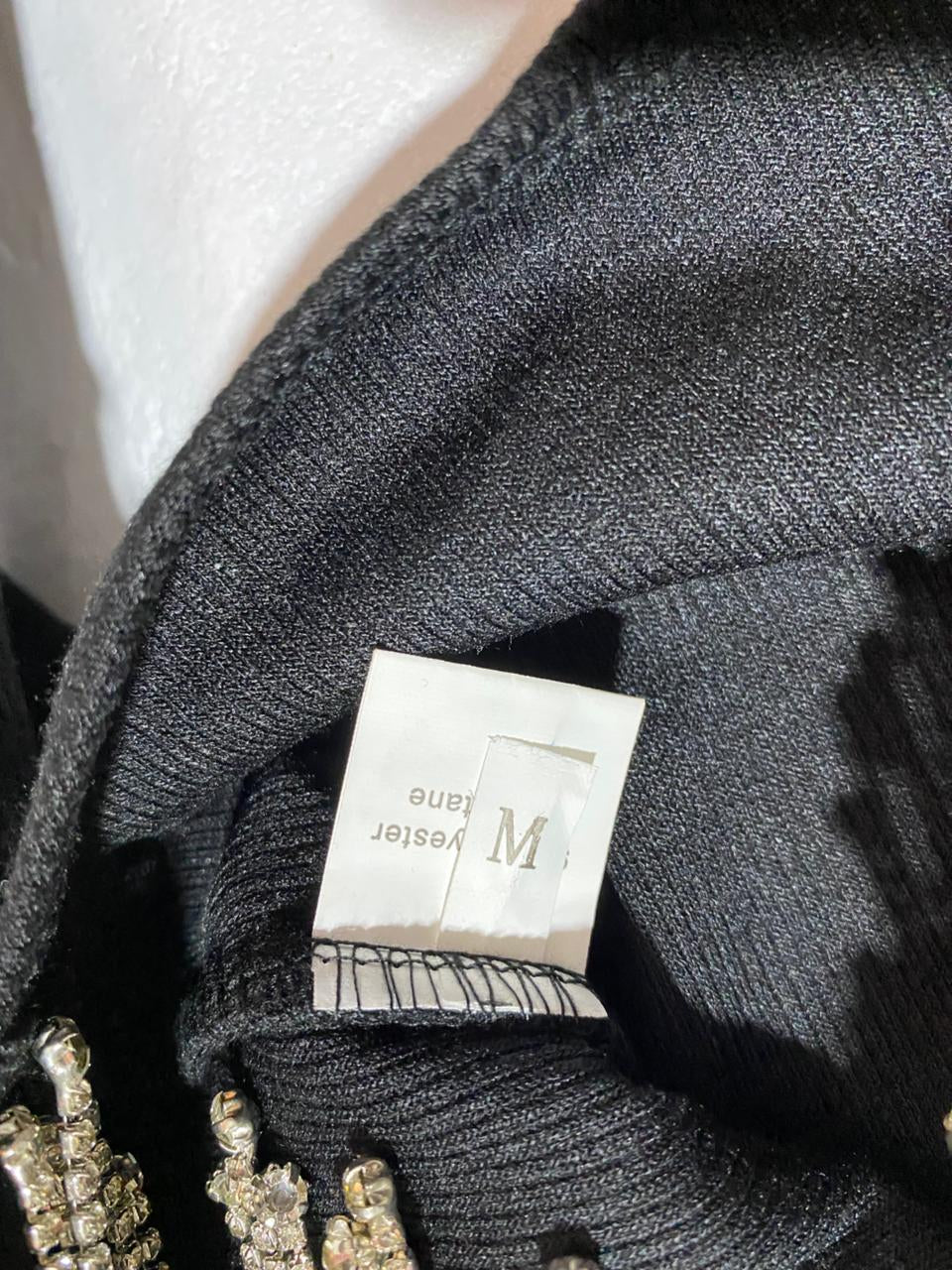 BLACK LONG SLEEVE CROP TOP WITH RHINESTONE FRINGE|M|BUST 15