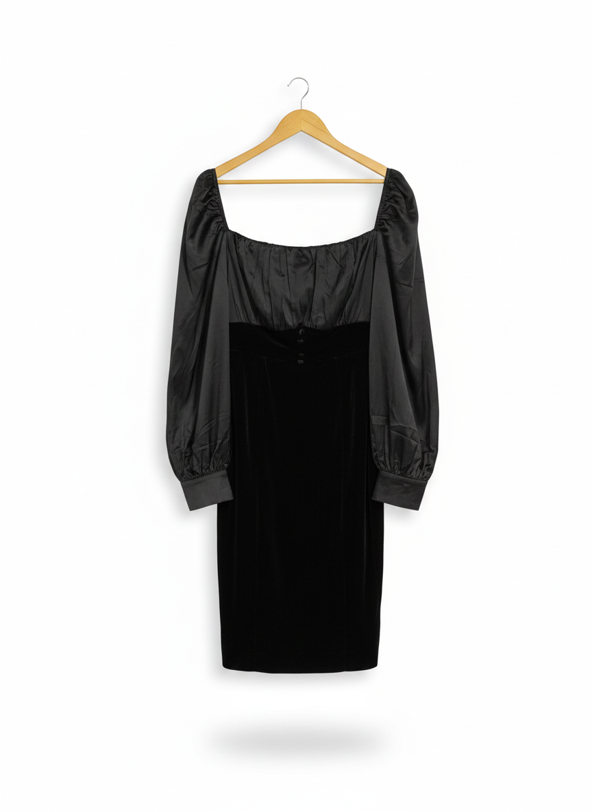 BLACK VELVET AND SATIN MINI DRESS WITH PUFF SLEEVES|L|BUST 16