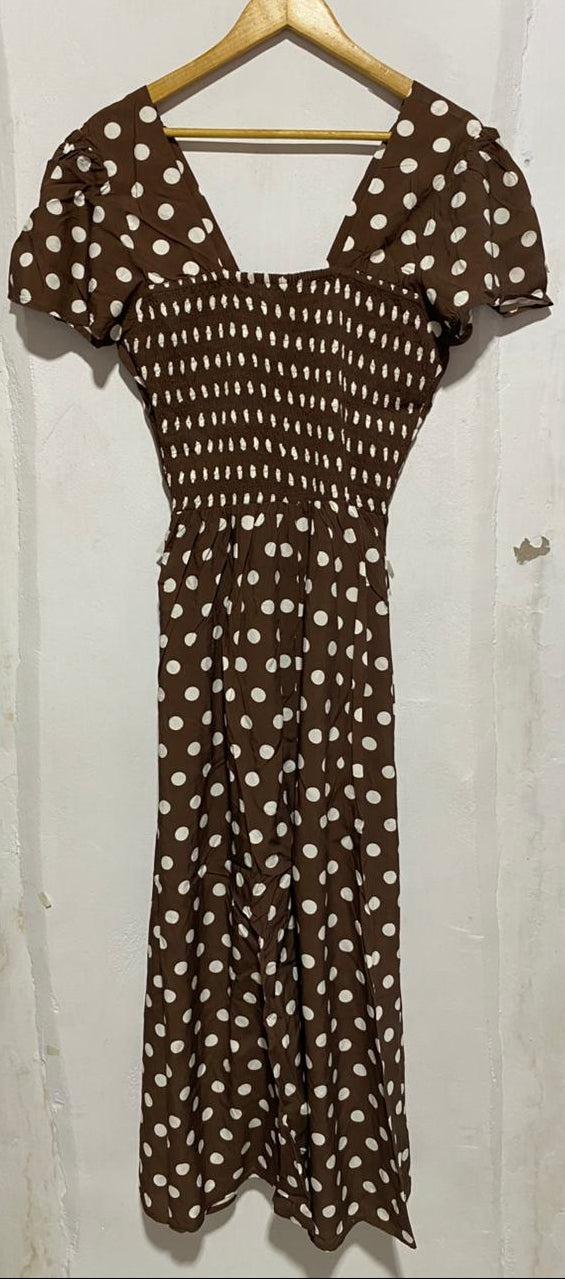 HAZEL&FOLK|L|BUST 17|LOCKLIN BROWN AND WHITE POLKA DOT MIDI DRESS