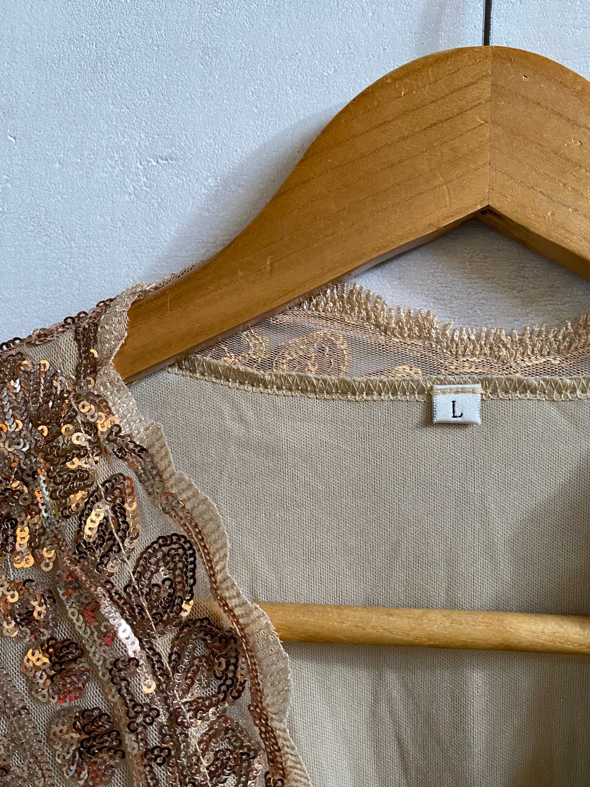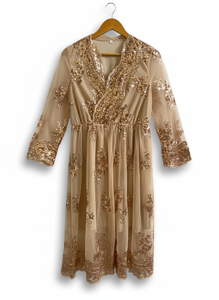 NUDE OR LIGHT GOLD SEQUIN MESH V-NECK MIDI DRESS|L|BUST 17