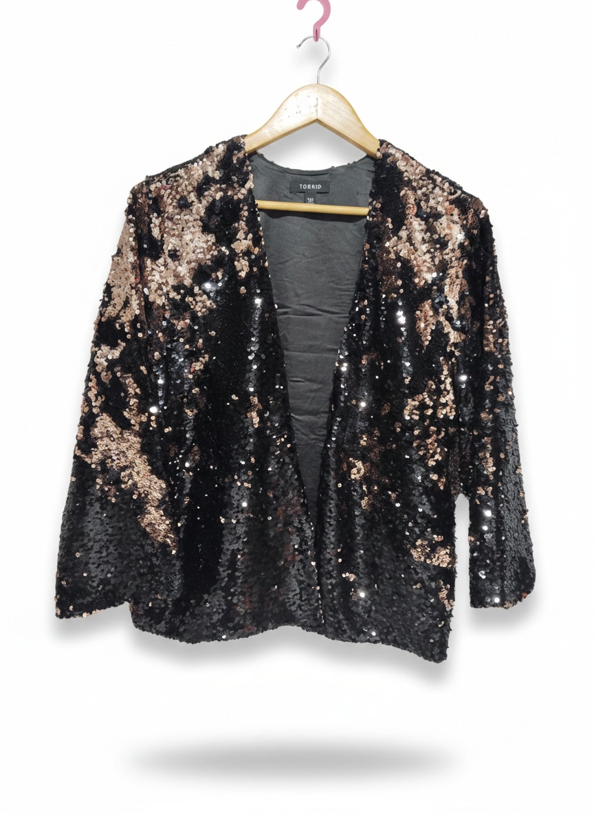 TORRID|FREE SIZE| BLACK AND GOLD TWO-TONE SEQUIN DRAPE OPEN-FRONT JACKET