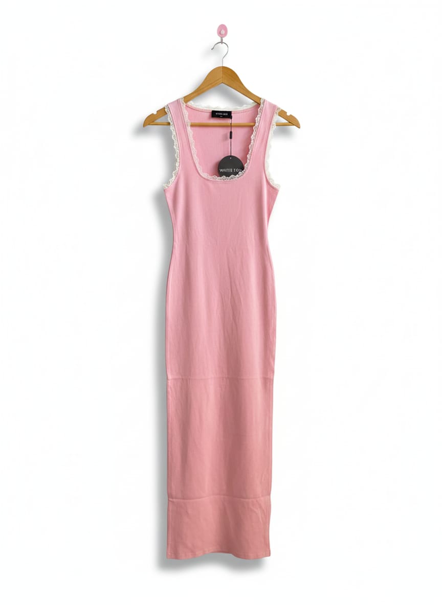 WHITE FOX|M|BUST 13|PINK RIBBED TANK MIDI DRESS WITH WHITE LACE TRIM