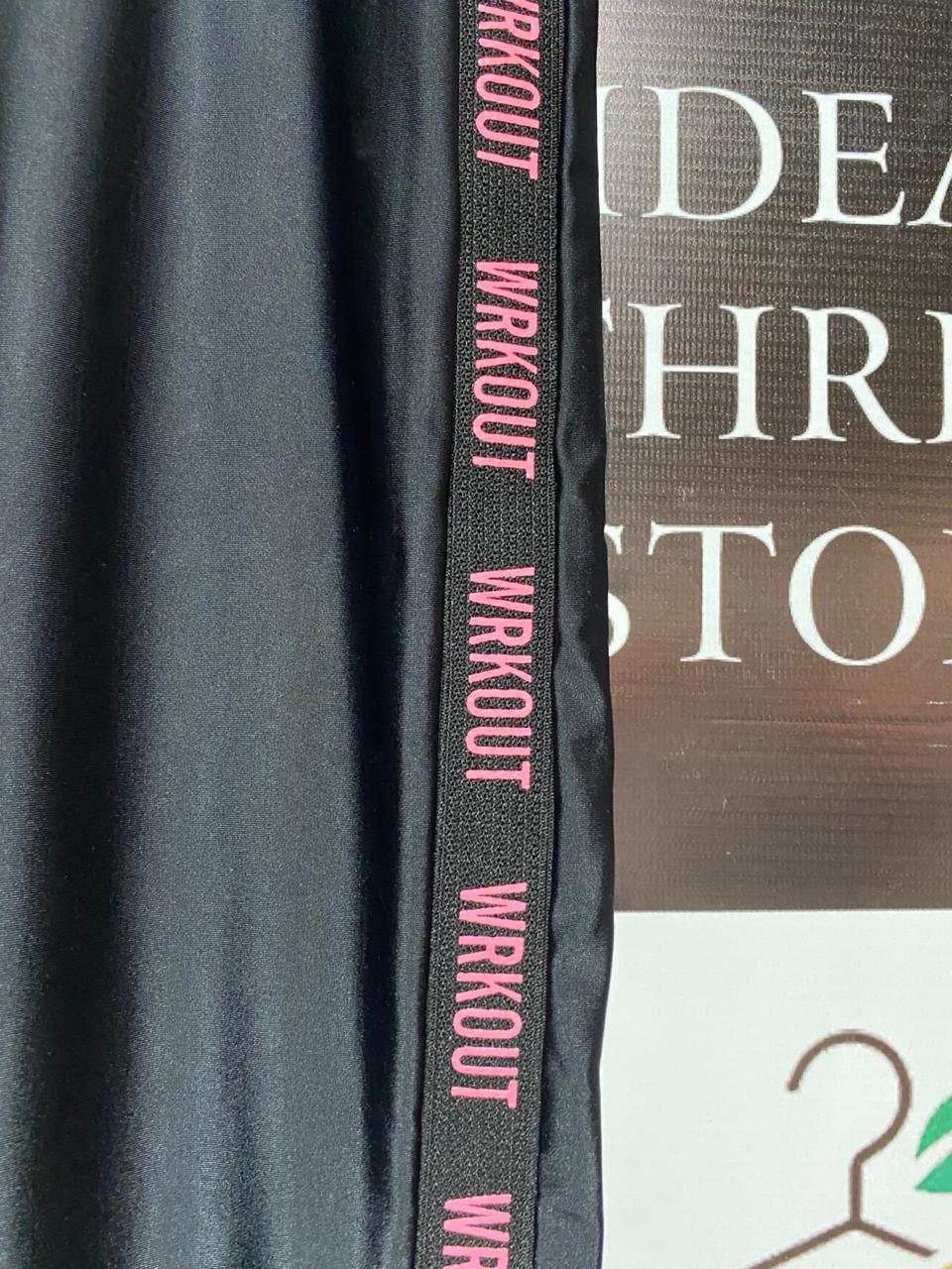 WORKOUT|M/L|WAIST 28|WOMEN'S BLACK HIGH-WAISTED ATHLETIC LEGGINGS WITH PINK WORKOUT LOGO SIDE STRIPES